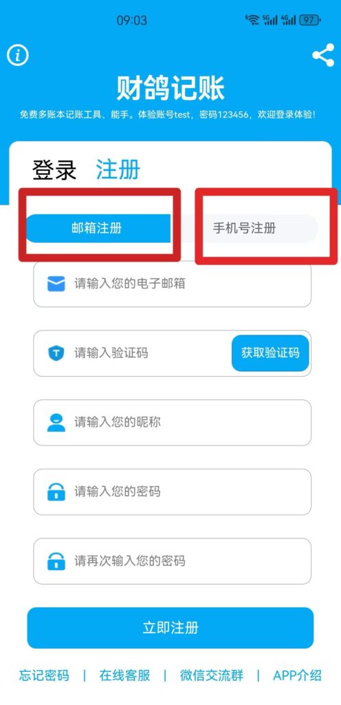 启动财鸽记账APP后,将进入登录界面,点击注册,将进入注册界面,注册简单快捷。提供多种注册方式: