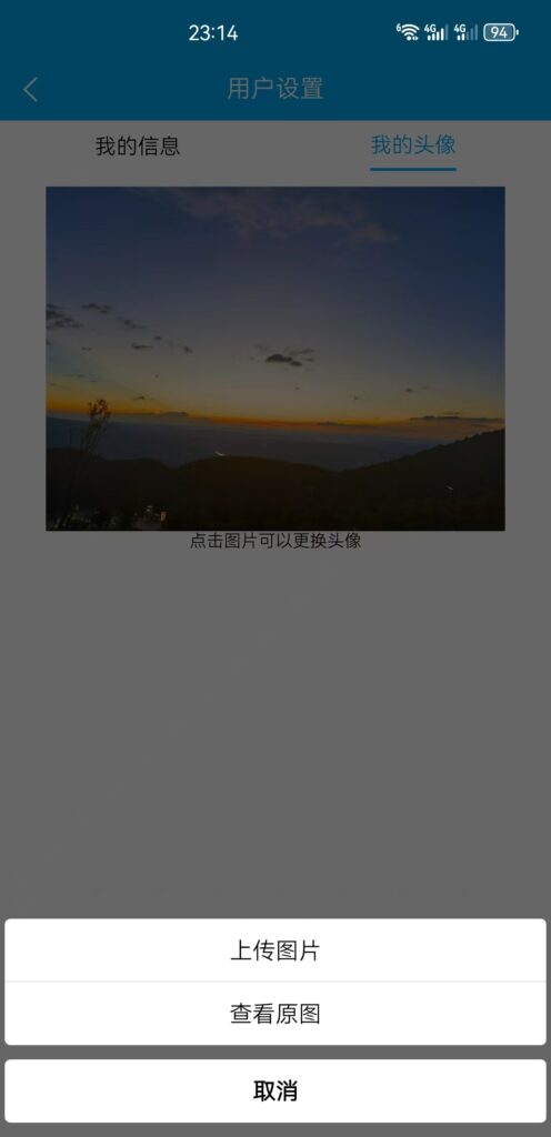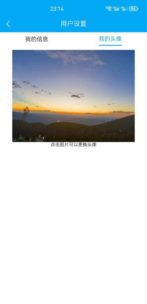 点击“我的”,点击上方图片,进入用户设置界面,点击自定义头像图片,将弹出从相册或者自拍选择图片上传,图片大小不超过2M。